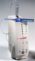 It is even held like a pen! Using the Wand is very enjoyable for the operator (that is, the dentist) because it is so light and easy to handle. To start the computer, the dentist uses a footpedal connected to the computer tower. The computer does the rest. That way, the operator can focus all attention on holding the handpiece in the right position. The cartridge holder, tube and wand handpiece are all single-use disposables. A "cool blue" "safety" wand handpiece with a self-retracting needle is also available (shown in the right-hand photo). The safety feature is there to prevent dental staff from accidentally poking themselves while getting rid of used handpieces. However, most dentists prefer the "standard" wand on the left, because they find it easier to handle.